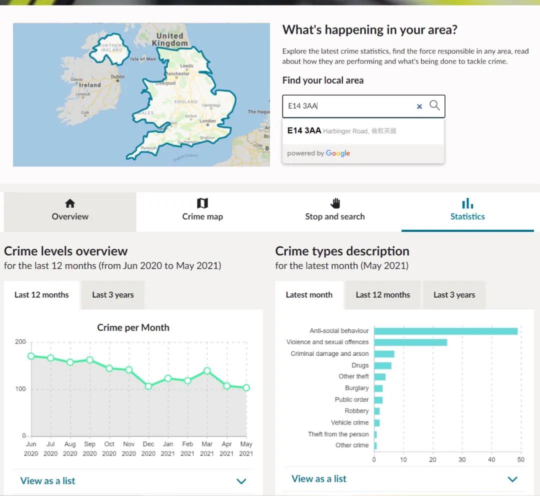 建议租房人在这一阶段,向房源发布者咨询周边安全问题,或者到www.police.uk英国警察局的官网查询固定区域的犯罪率等信息。查询时输入房源所在地邮编即可查询。