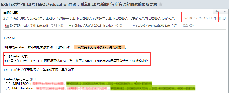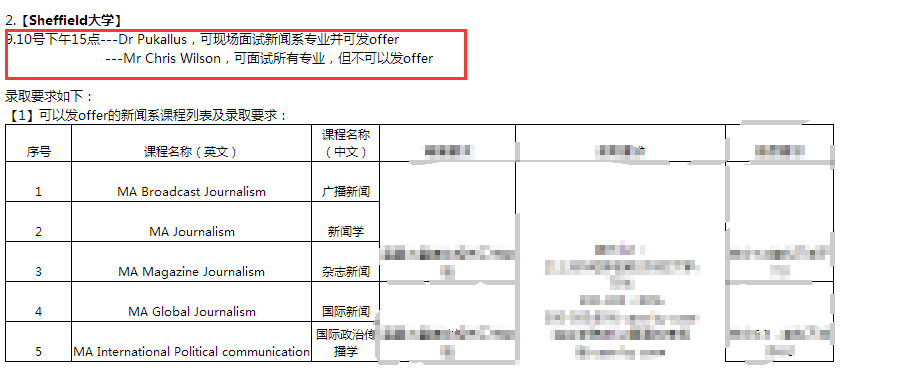 9月中旬exeter,谢菲两场面试活动 1. 【Exeter大学】 9.13号上午10点&mash;Dr. Li Li, 可现场面试TESOL学生并可发offer,Eucation课程可以给出90%准确建议 2.【Sheffiel大学】 9.10号下午15点&mash;Dr Pukallus,可现场面试新闻系专业并可发offer &mash;Mr Chris Wilson,可面试所有专业,但不可以发offer。