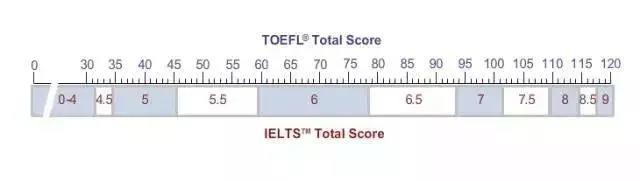 雅思成绩总分是9,托福成绩总分120,ETS官网曾给出过托福和雅思分数对比尺: