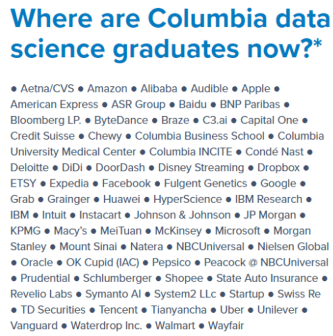 哥伦比亚大学的数据科学硕士项目开设在哥伦比亚大学的数学科学研究所Data Science Institute (DSI), DSI成立于2012年集合了哥伦比亚大学在计算机科学,统计学,工业工程与运筹等方面的优势资源,由统计系,计算机系和工业工程与运筹系的教授联合授课,学生有机会进行原创研究,进行实习以及与世界顶级的教授等互动学习。DSI的教授的研究方向集中在气候,健康,社会公平,商业与金融,以及数据科学基础等领域,学生可以根据自己的兴趣,进行选课以及与相关领域的教授进行科研项目。