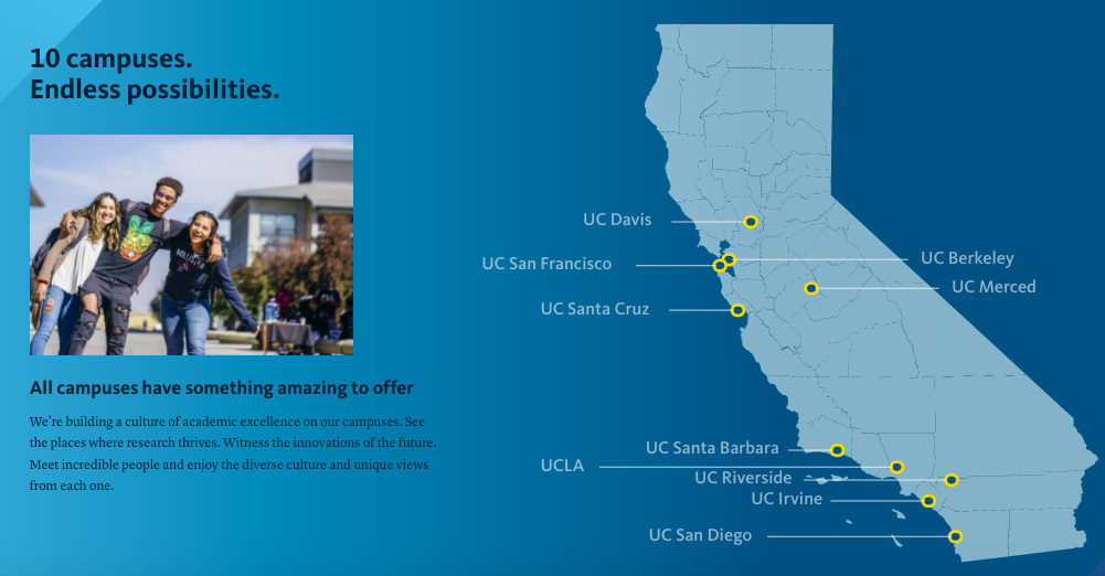 加利福尼亚大学(University of California),简称加州大学(UC),是美国加利福尼亚州拥有十个校区的大学系统,是世界上最具影响力的公立大学系统之一,被誉为“公立高等教育的典范”。加州大学已发展成一个拥有十个校区并对世界发展影响深远的大学系统。