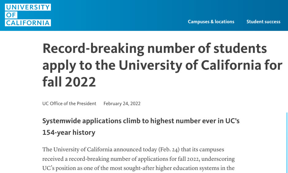 2月24日,美国加州大学系统公布了2022年秋季收到的申请数量,创下154年来历史新高。 与2021年相比,全系统的新生申请增加了7140人,从2021年秋季的203,700人增长3.5%至2022年秋季的210,840人 。