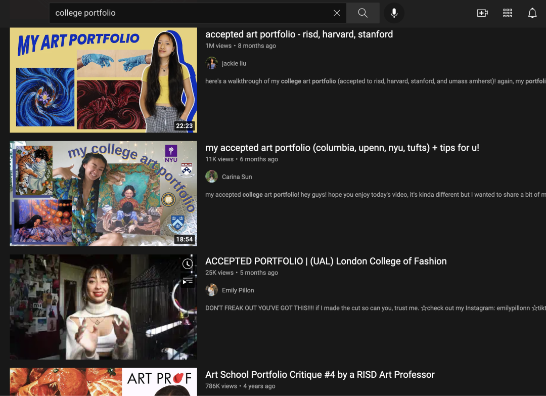 可以去国内外的网站搜索College Portfolio ,有很多之前申请的同学都会以视频或者笔记的方式来介绍自己的作品集。这其中不乏考上RISD、ACCD,UAL等其他著名艺术院校的高手。他们的作品集思路、创作过程和材料使用也许会为你带来灵感。