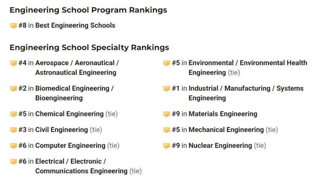 航空航天工程、生物医学工程、化学工程、土木工程、工业制造工程、机械工程全部全美前5。
