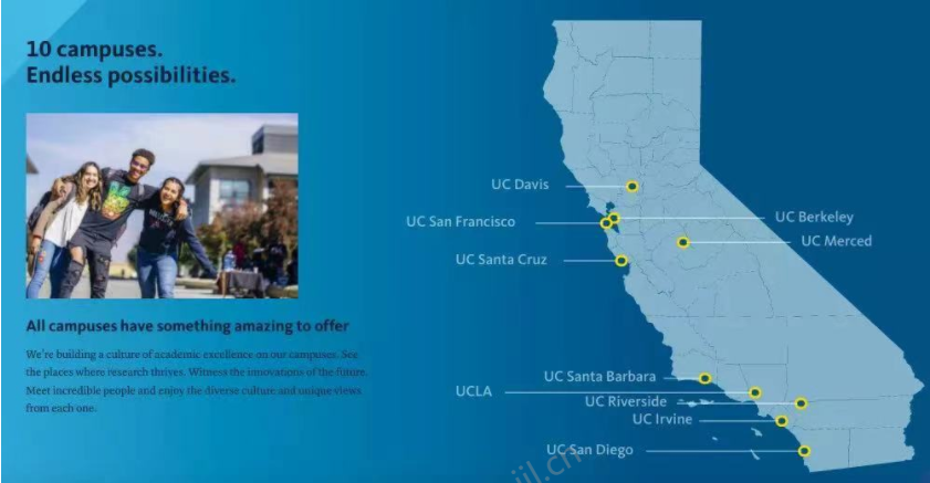 加利福尼亚大学(University of California),简称加州大学(UC),是美国加利福尼亚州拥有十个校区的大学系统,是世界上最具影响力的公立大学系统之一,被誉为“公立高等教育的典范”。加州大学已发展成一个拥有十个校区并对世界发展影响深远的大学系统。 十个校区的具体位置如下。