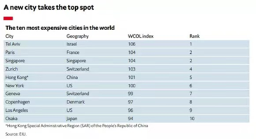 从上图中我们可以看到位列前十的城市是:以色列的特拉维夫、法国巴黎、新加坡、瑞士苏黎世、中国香港、美国纽约、瑞士日内瓦、丹麦哥本哈根、美国洛杉矶和日本大阪。快看看你的留学城市了吗?