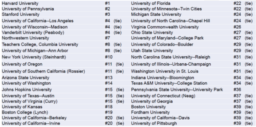 总体来说,顶级名校的项目申请难度较大,两级分化也比较大,以下是U.S.News上最佳教育学院的排名: