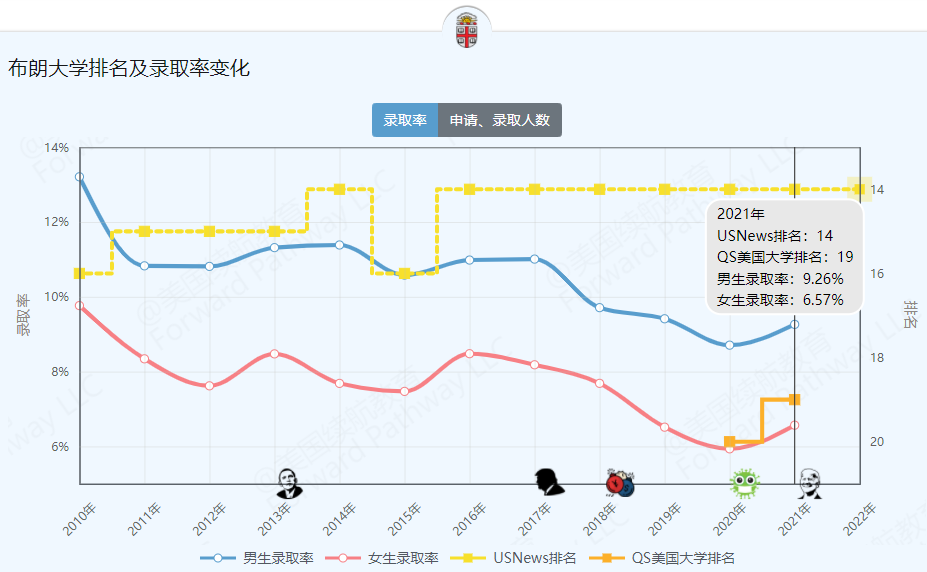 布朗大学这么多年在US.News的排名可以说是“稳如泰山”,从2018年开始录取率就一直在10%以下。2021年秋季的录取率出现了多年来少见的提高,特别是男生录取率高出女生2-3个百分点,想要学习应用数学的男同学们,可以把握机会冲刺布朗!