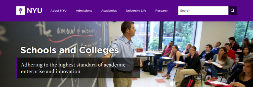 纽约大学 (New York University),成立于 1831 年,是全美最大的私立大学之一,也是美国唯一一座坐落于纽约心脏地带的名校。 其US NEWS 美国综合排名29位,世界排名28位, 设课程压力不大,但要求甚高。而34名诺贝尔奖得主更是使纽约大学光芒四射,享誉世界。纽约大学较为偏重人文艺术及社会科学,研究生院享有很高的声誉。属下的帝势艺术学院是全美最佳的美术学院之一;斯特恩商学院由于得到地灵人杰之助,是蜚声世界的著名商学院,聚集着世界最顶尖的人才;柯朗数学科学研究所是美国排名第一的应用数学研究机构;沙克房地产研究所是美国房地产业界著名的高水平研究机构,和美国金融和地产界联系紧密。