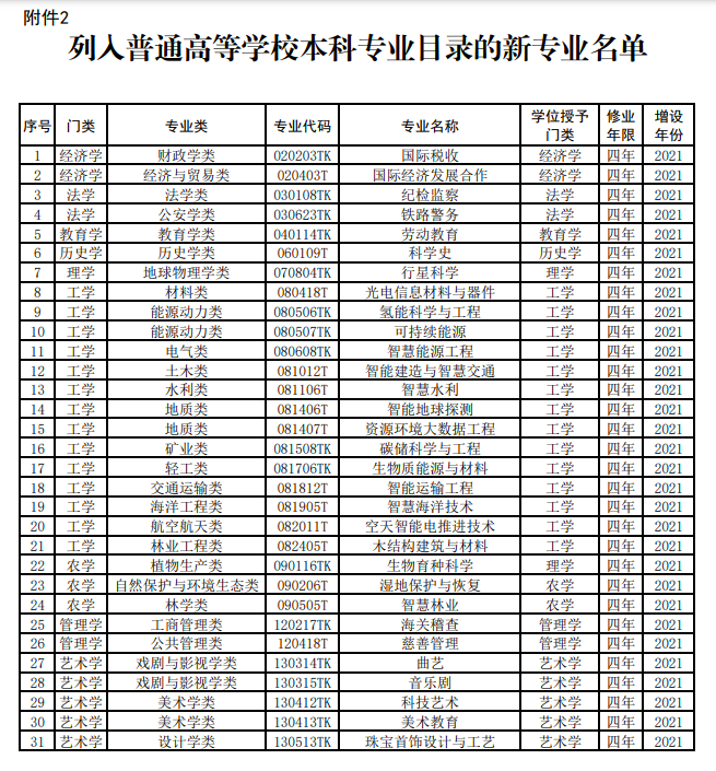 2月24日,教育部公布了2021年度普通高等学校本科专业备案和审批结果,新增1961个专业点、撤销804个专业点,31种新专业列入《普通高等学校本科专业目录》。详情如图: