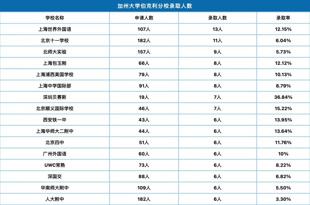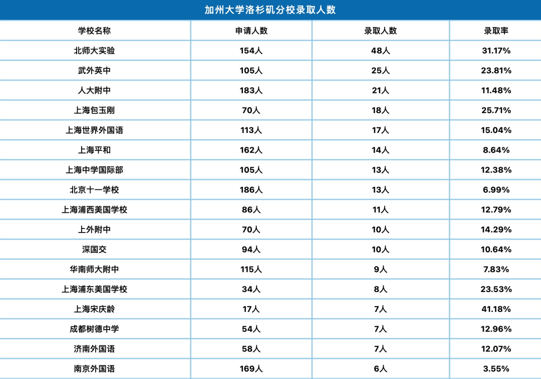 以加州大学伯克利分校和洛杉矶分校为例,看一看在他们在中国大陆2021年录取本科新生人数较多的学校是哪些吧~