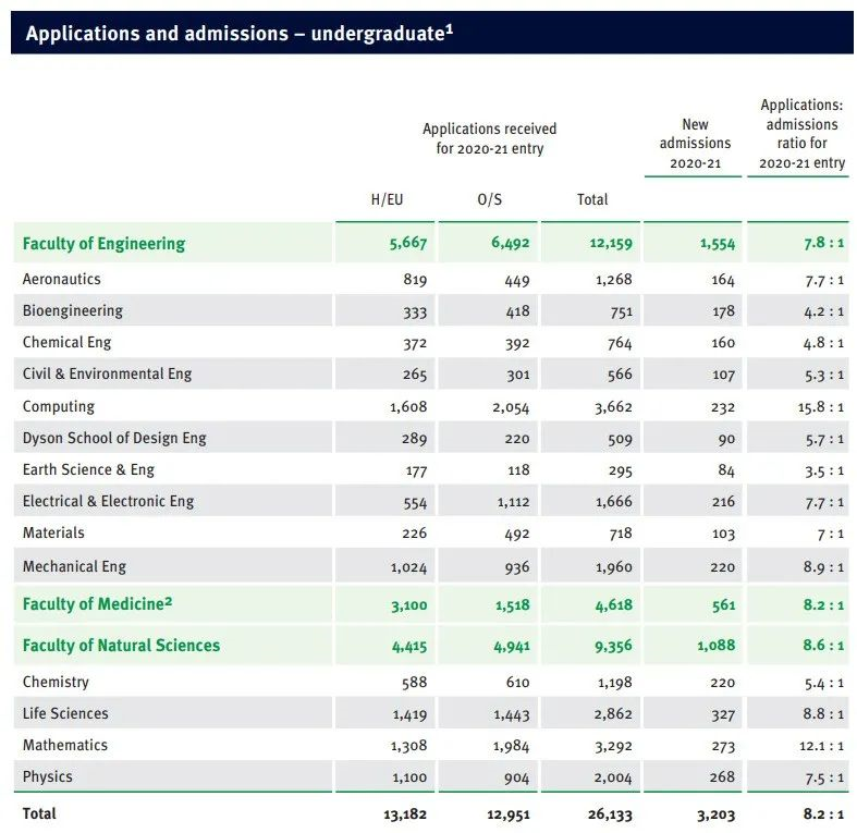 帝国理工本科总申请人数26,133人,整体8.2录1。然而不同学院、不同学科的申请热度差距可能很大。