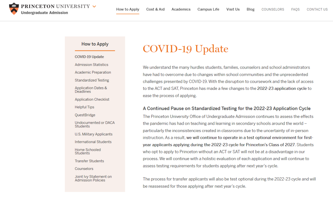普林斯顿大学本科招生办表示:考虑到疫情对世界各地中学教学的影响,在没有ACT/SAT成绩的情况下,申请普林斯顿的学生不会处于不利地位,会继续对每个申请进行全面评估。同时, 在2022-23学年期间,转学申请者也适用“标化可选”政策 。