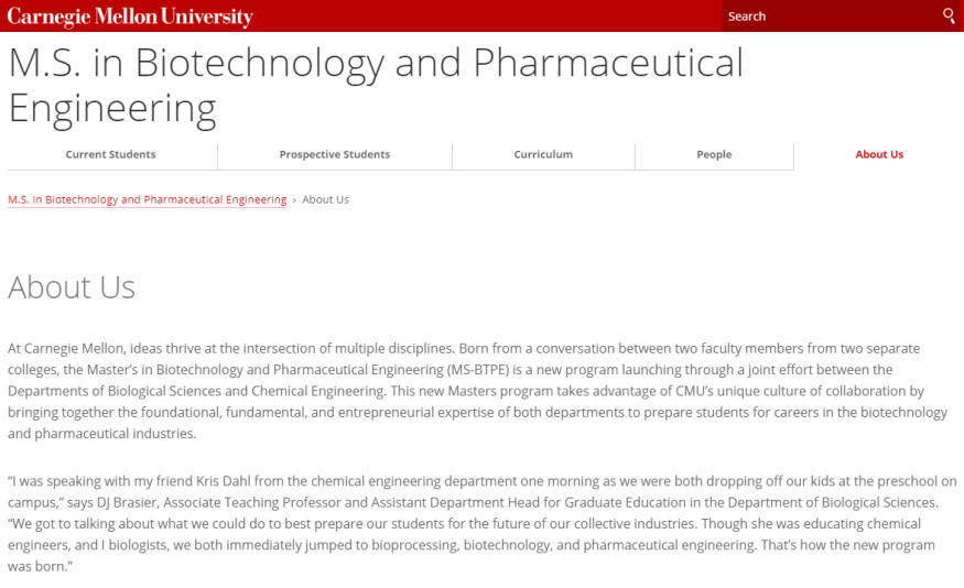 该项目是在生物科学系和化学工程系的共同努力推出的新项目,课程利用CMU独特的合作文化将两个系的基础理论和专业知识结合在一起,为学生在生物技术和制药行业的职业生涯做好准备。