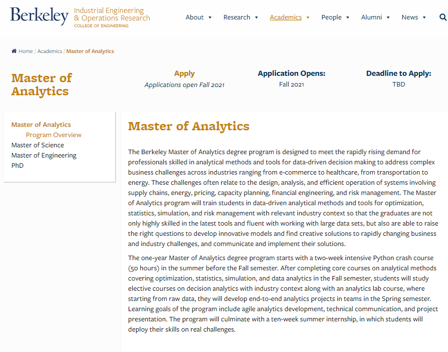 该专业开设在IEOR 学院下,也是UCB开设的研究生项目中,唯一一个独立的ata有关的项目,将于22Fall招收第一批学生。