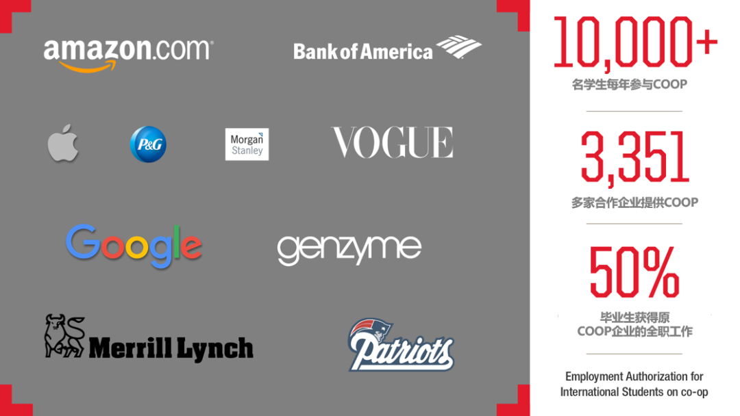 每年,有超过10,000名学生参与CO-OP带薪实习项目,3,351家合作企业为东北学子提供带薪实习,50%的毕业生获得原CO-OP合作企业的全职Offer,怎么样,着实羡慕了吧!