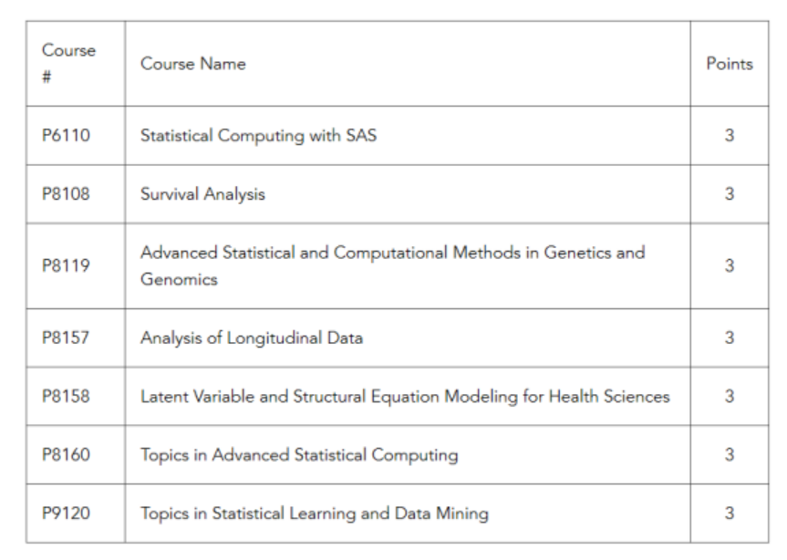 项目除了生物统计学理论、方法和应用方面的核心培训之外,特别强调现代统计学习方法、编程能力以及数据管理能力的培养。 除了完成他们的课程作业外,所有 学生还要完成一个学期的实习和实践课程。 实习经验是 PHDS 项目的重要组成部分,不仅为学生提供了将课堂上学到的知识应用于现实世界的机会,同时提供了对未来职业机会的体验。