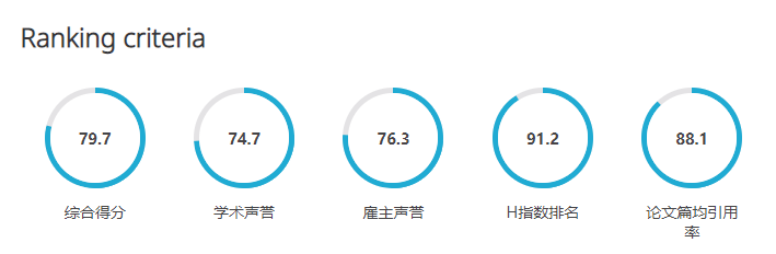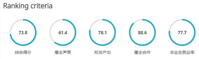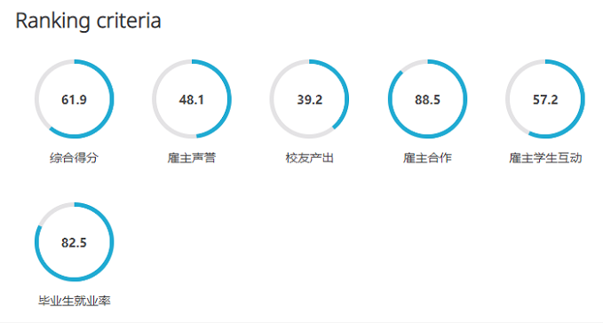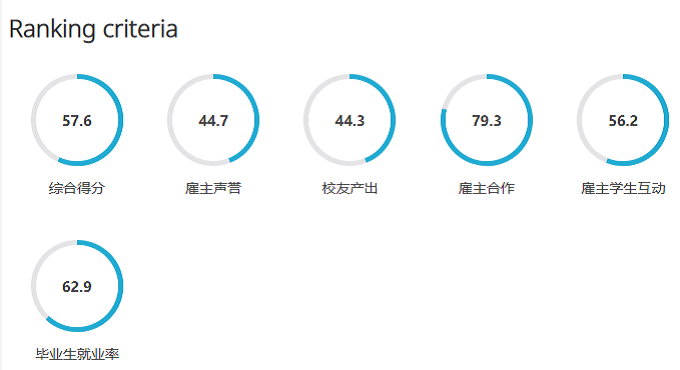 E. 毕业生就业率(分值占比: 10% ) 这个指标是最简单最直观的,但对于了解大学在培养就业能力方面至关重要。其涉及衡量在毕业后 12 个月内从事全职或兼职工作的毕业生(不包括选择继续深造或无法工作的毕业生)的比例。