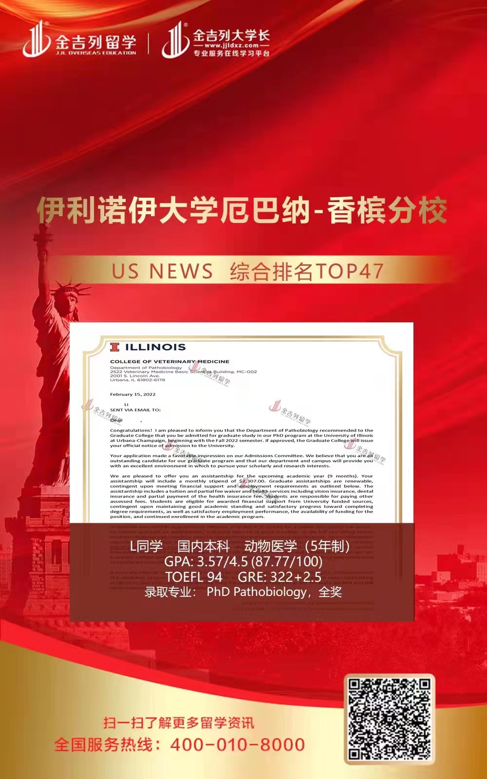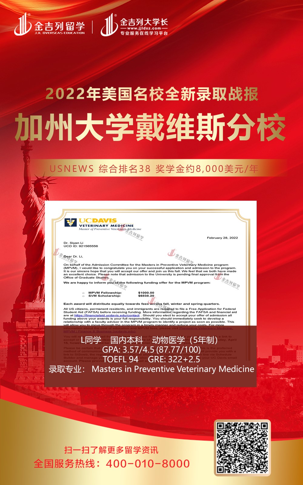 学生最大的优势在于软性背景学术性很强,GRE的成绩很满意。在跟教授面试中,特别提到很满意学生的标化成绩。学生的研究方向跟教授方向的研究背景十分契合。文案老师提取学生的优势着重凸显文书,量化学生的背景。递交申请后,跟学生前后约了3次面试,最终拿到UIUC全奖博士,录取后,又拿到了UCD加州大学戴维斯分校的预防兽医的硕士录取。加州戴维斯分校是世界兽医专业排名第一的院校。