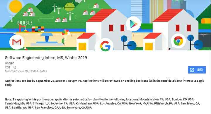 谷歌现面向在攻读计算机科学等计算机领域的本科生、研究生开放软件工程实习岗位,12-14周带薪实习,实习地点:Mountain View,Bouler,Cambrige,Chicago,Irvine,Kirklan,Los Angeles,New York,Pittsburgh,San Bruno,Seattle,San Francisco,Sunnyvale。有数据结构与算法经验(包括校内外实践、个人项目、课程项目等),有使用C、C++、Java、JavaScript、Python软件开发经验… 申请截止日期:2018年9月28日。