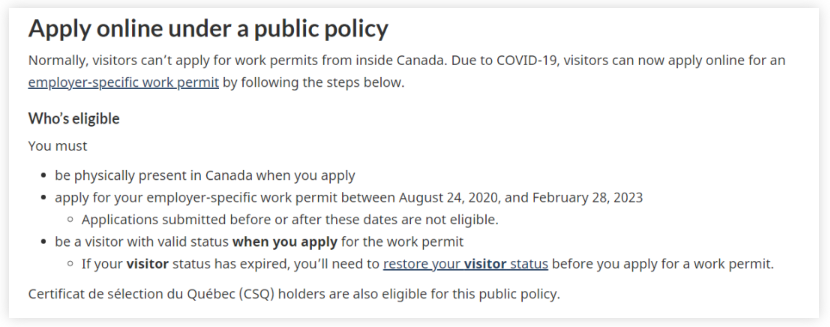 加拿大移民部曾在疫情初期推出了一系列暖心的临时措施,如延长申请期限、豁免申请条件等等。加拿大移民局IRCC于2020年8月24日出台了游客在加拿大境内申请工作签证,当时公布的临时政策将于2021年3月31日截止。随后,移民局又将该政策延期到2022年2月28日。
