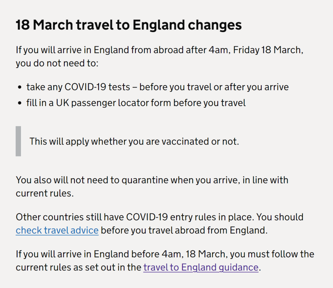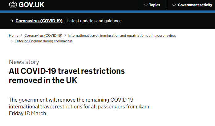 英国交通部宣布,从3月18日凌晨4点开始,所有入境英国的旅客,无论是否接种过新冠疫苗,都不再需要任何形式的新冠病毒检测,入境后也无需隔离,并且不再需要填写旅客定位表,完全恢复到疫情前的开放政策。