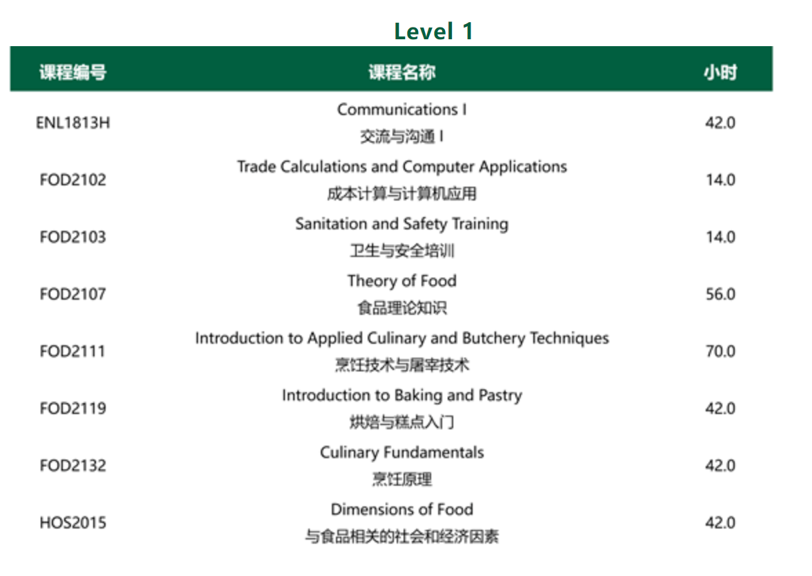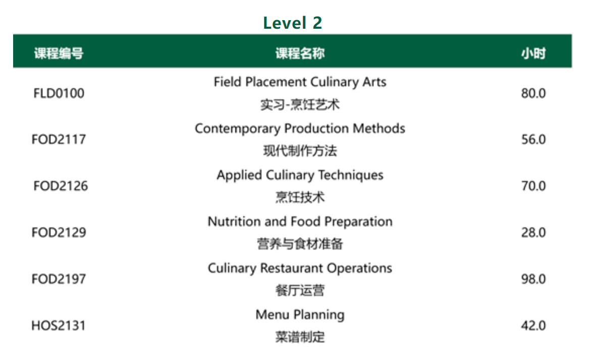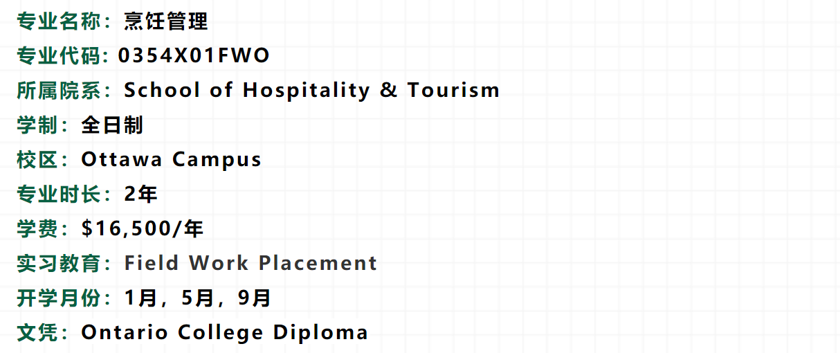 该课程为学生在快速发展的烹饪行业中提供最新的知识和最先进的技术, 重点培养学生高级烹饪技术,管理能力和实际操作能力。课程包括:食材准备、烘培艺术、成本控制、营养学、菜谱制定、摆盘、餐饮服务、清洁和安全监测及餐饮创业技能等。通过160小时的现场实习,学生将积累行业经验,与烹饪行业建立联系。学生有众多机会参与社区活动、烹饪比赛及行业活动,可充分提高个人技能并获得宝贵经验。