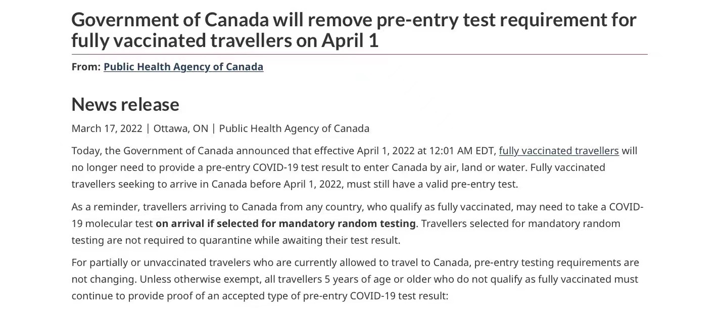 加拿大联邦政府于加拿大当地时间 3 月 17 日正式宣布,将取消对完全接种疫苗的旅行者抵达前的 COVID-19 检测要求。 自 4 月 1 日凌晨 12:01 起,完全接种疫苗的旅客无需再提供入境前的 COVID-19 检测结果,即可通过航空、陆路、水路进入加拿大。但计划在 4 月 1 日之前抵达加拿大的完全接种旅客仍需进行有效的新冠检测。 加拿大卫生部长表示,“宣布的消息令人振奋,但要知道的是,所有措施都需要一段时间进行审查。随着加拿大和国外疫情的发展,我们将继续对其进行调整。” 根据目前的规定,所有进入加拿大的旅客,无论疫苗接种状态如何,都必须出示在航班 / 抵达加拿大后 24 小时进行的 COVID-19 抗原检测阴性证明。或者,也可以提供过去 72 小时内的 PCR 阴性检测报告作为替代。 但是,从下个月开始,完全接种过两剂加拿大批准的 COVID-19 疫苗的旅行者,则不再需要出示阴性检测证明。 加拿大卫生部长补充说,虽然完全接种疫苗的人在抵达加拿大时可能仍需要接受随机检测,但他们不必在等待结果时进行隔离。目前,加拿大认可的疫苗如下,其中也包括中国国药和科兴两种疫苗。 值得注意的是,未接种疫苗和部分接种疫苗的旅客将在抵达时和 8 天后分别接受 PCR 检测,还必须隔离 14 天。 此外,所有旅行者,无论接种疫苗状态如何,都必须在进入加拿大前登陆 ArriveCAN APP 填写疫苗接种证明和其他所需信息。并且,如果想要在加拿大境内乘坐飞机、火车、游轮,仍被要求完全接种疫苗才行。 加拿大交通部长表示,对于那些计划 4 月初开始旅行的邮轮乘客,仍将被要求在出发前 1 天内进行 COVID-19 抗原检测,但不再需要在下船前进行检测。游轮的所有其他要求仍然有效。