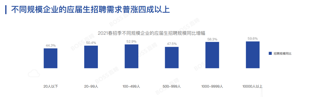 根据Boss直聘发布的《2021应届生就业趋势报告》,2021年春招时,不同规模企业的应届生管招聘同比增幅均超过40%。其中,万人以上规模的大型企业应届生需求量同比增幅达到59.6%。