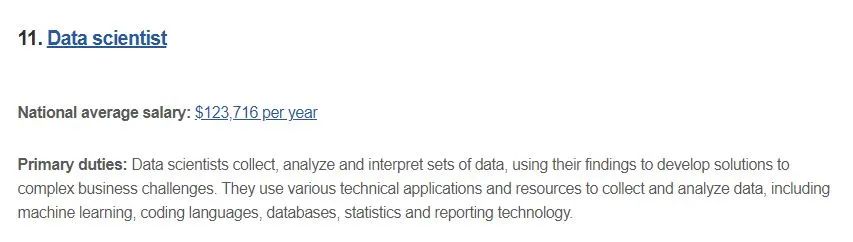 Data行业的薪资相比其他行业非常有优势——世界最大招聘搜索引擎inee统计了 2021年25个最高薪职位排名 ,Data Scientist赫然在榜。