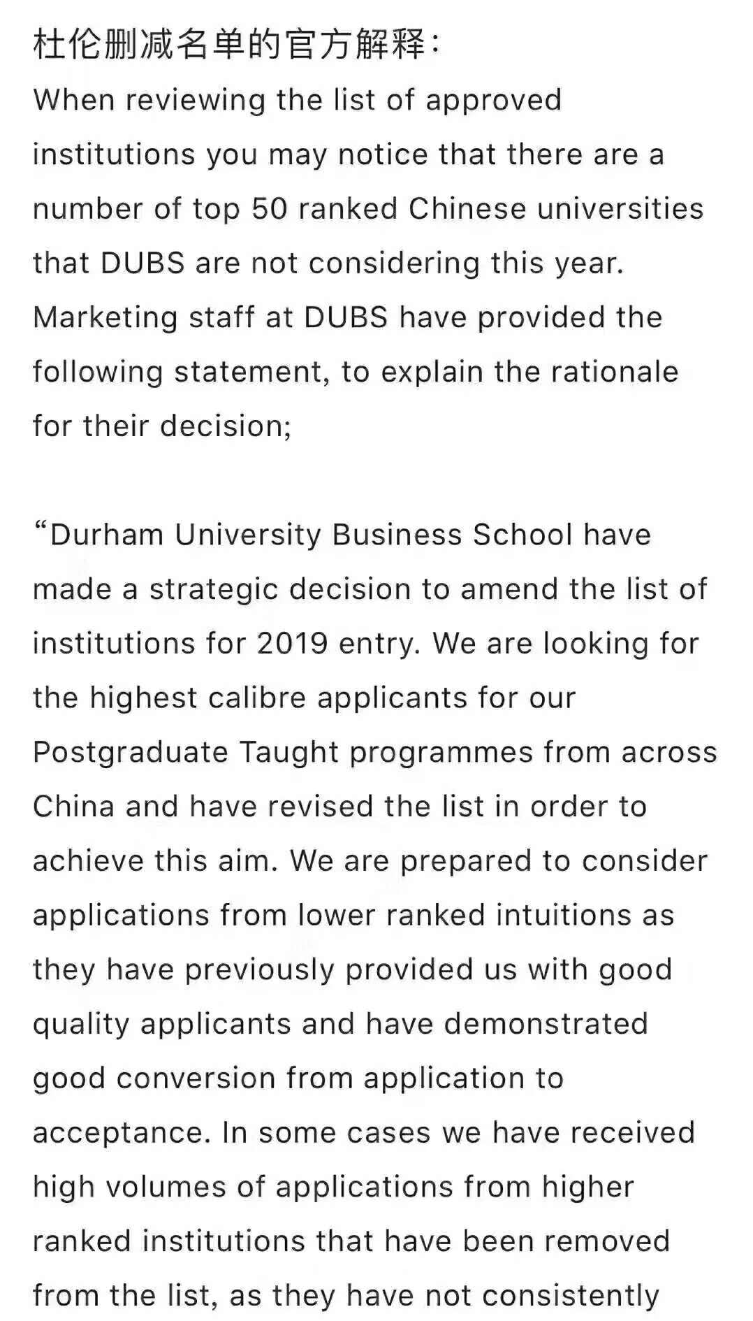 2018年8月25日,杜伦官方发布了关于取消国内前50院校申请资格的声明,官方声明原因如下图