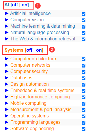 本次排名我们只看美国地区的计算机科学学术机构, CS Rankings细分为4个大类(共26个小项):AI人工智能、Systems系统、Theory理论和Interisciplinary Areas跨学科领域。