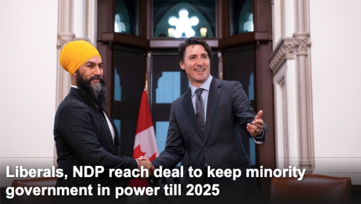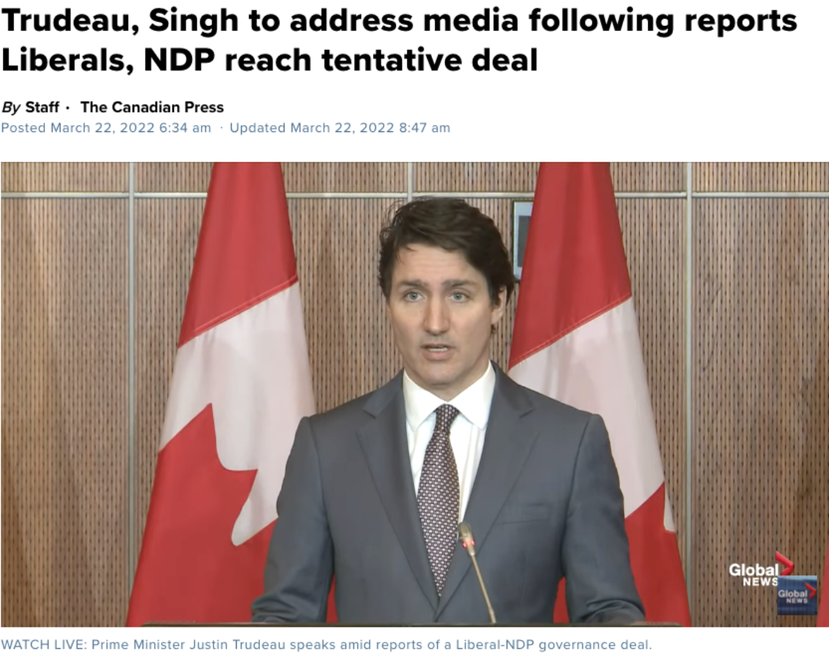加拿大总理贾斯汀·特鲁多(Justin Trueau)3月22日宣布,自由党已与联邦新民主党(NDP)达成协议,有了NDP支持,这样可以保证自由党可以“稳定”将执政至2025 年,期间将会优先实施两党共同同意的内容,包括低收入家庭免费牙医,启动全国药保计划,解决住房危机以及带薪病假等等。