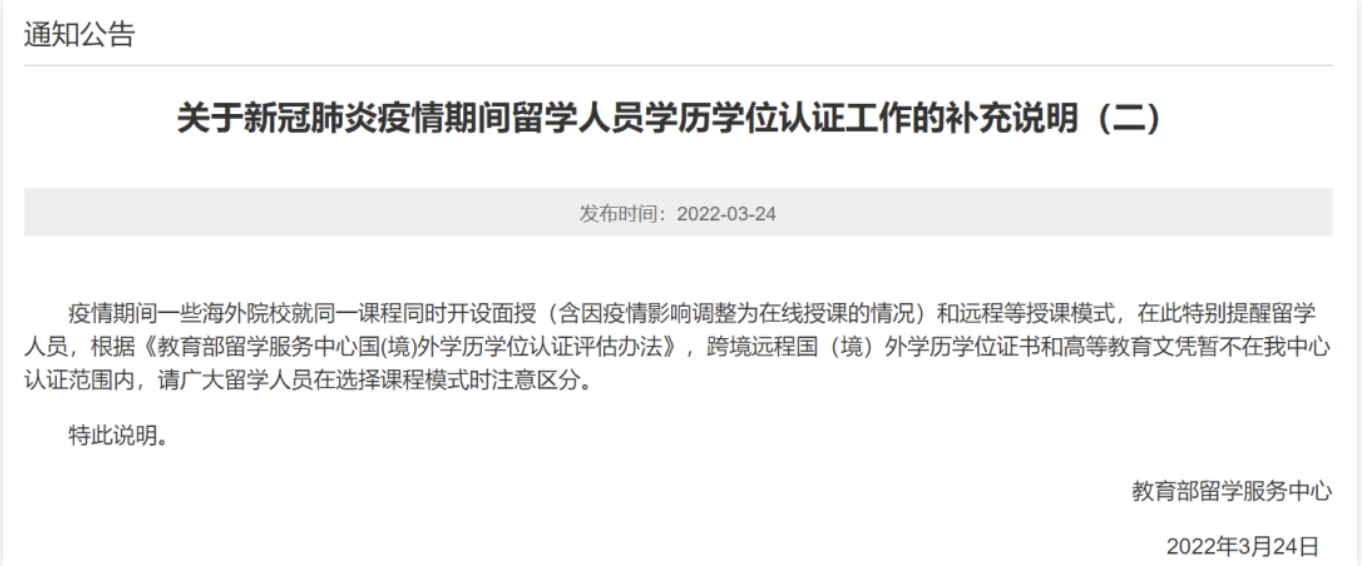 从通知中可以看到: 根据《教育部留学服务中心国(境)外学历学位认证评估办法》,跨境远程国(境)外学历学位证书和高等教育文凭暂不在我中心认证范围内,请广大留学人员在选择课程模式时注意区分。