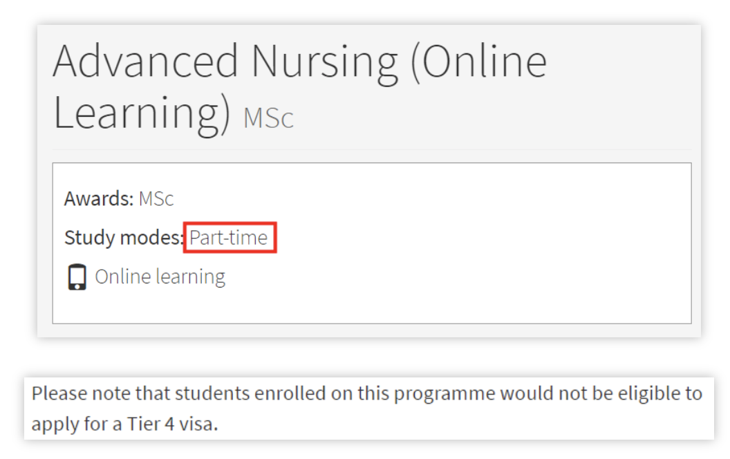 比如图中的“Avance Nursing (Online Learning)”课程,点进详情发现: 一是该课程是非全日制的;二是它无法申请Tier 4学生签证:
