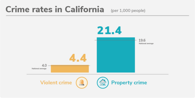 在加州,每1,000人平均发生 4.4 起暴力犯罪事件,超过了全国 4.0 的比率;每1,000人平均发生 21.4起财产犯罪事件,高于全国 19.6 的犯罪率。