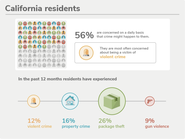 在过去12个月中,有12%的加州人经历了暴力犯罪(全美10%),有16%的加州人经历了财产犯罪(全美18%),有26%的加州人经历了包裹失窃(全美20%),有9%的加州人经历了枪支暴力(全美8%)。