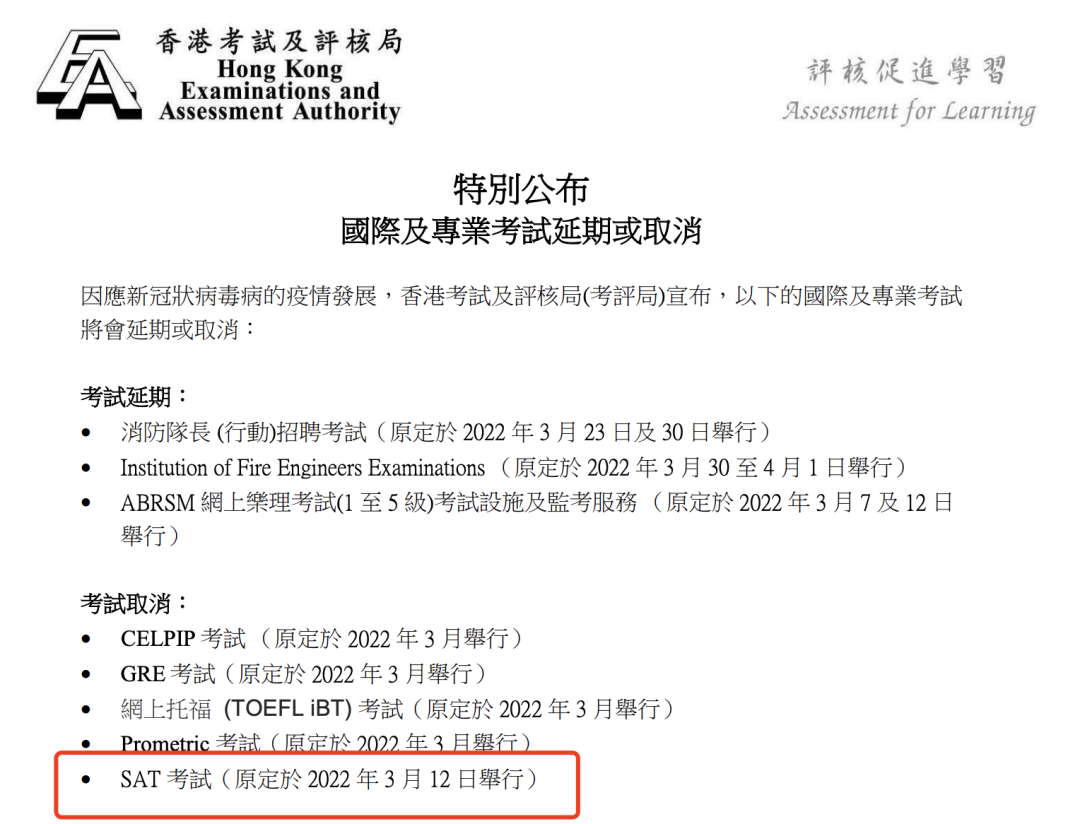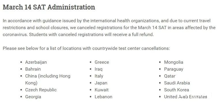 而随着这份公告的发出,全球已有17个国家和地区,确认取消3月的SAT考试了。