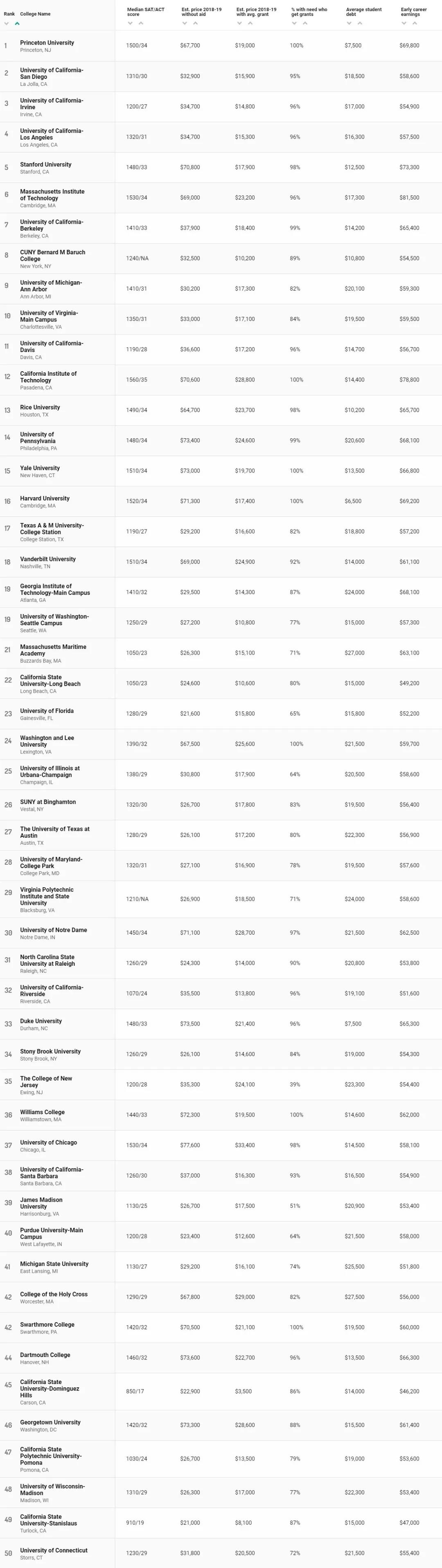 跟其他榜单不同, 此次的指标不仅看重学费,还看着回报率。 教育质量、可承受度、产出这三大标准共包含了18项指标,在比较高校性价比上已经非常全面了。