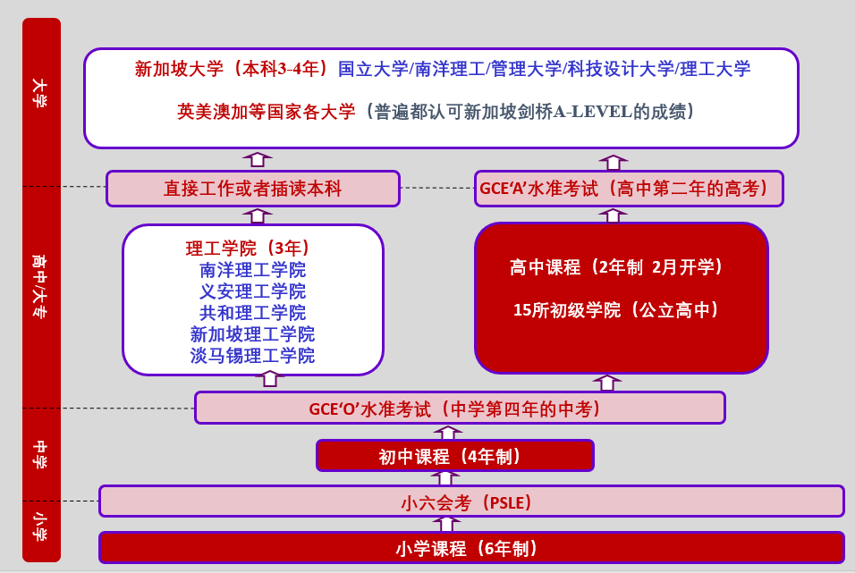 程序: SM1的招生考试多在7月底8月初举行,招生工作由对口学校独立进行。被录取的初三毕业生将会在新加坡首先进行2个月预科学习,于次年1月进入中三,中四毕业后参加英国剑桥O水准统考,根据考试成绩入读新加坡的高中(初级学院)。