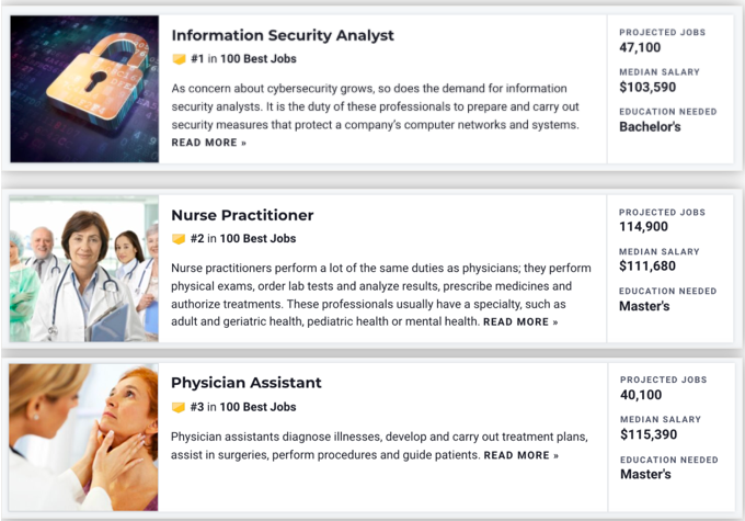 不难发现,在今年的职业排名中,医疗保健相关的职业取得了不俗的成绩。事实上,在今年的OP100中,与医疗健保相关的岗位占据了40%,这也充分说明了医疗保健行业才是当下美国社会最受欢迎、需求量最大的职业领域。
