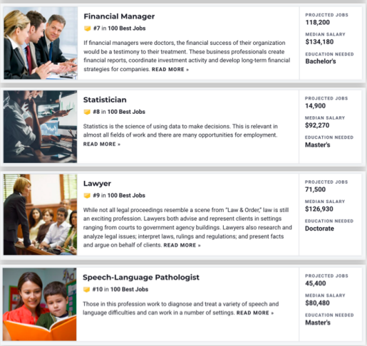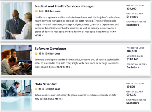 本次U.S.News的年度最佳职业排名是通过分析联邦劳工数据来确定最热门的工作,然后根据该职业在过去10年的增长速度、中位数工资、就业率、未来工作前景、压力水平和工作与生活的平衡来进行评分。
