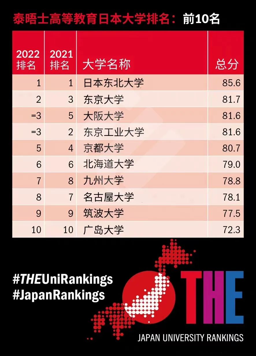 - 日本东北大学蝉联榜首; - 东京大学、九州大学均上升一位,依次升至第2和第7; - 大阪大学和东京工业大学并列第3;