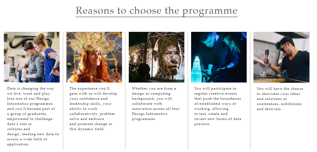Design Informatics专业是由爱丁堡大学艺术学院College of Art和信息学院School of Informatics共同合作开设的专业,在两个学院分别单独招生,共同授课。
