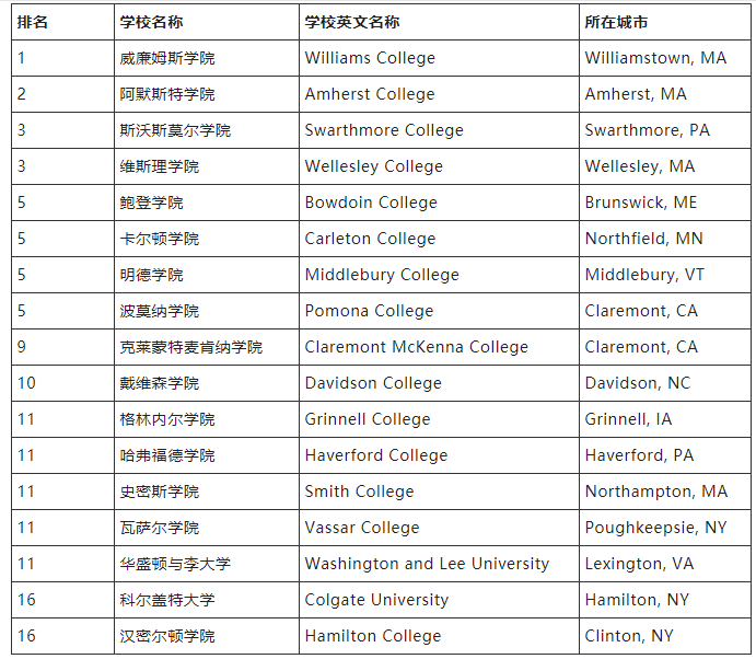 U. S.News发布的National Liberal Arts College Ranking (列出前16)