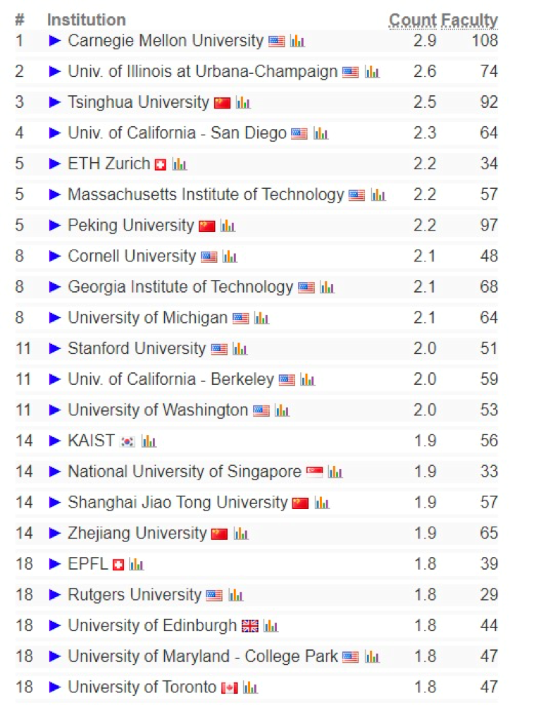 今年的榜单TOP10中有7所美国大学,卡耐基梅隆大学无疑再度占据榜首,并且在数据上多年来保持着断层式的压制,可见其在计算机领域的雄厚实力!