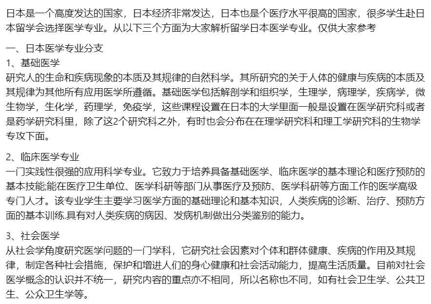 以上就是为你介绍的从三个方面介绍留学日本医学专业,希望对想要留学日本的同学能够有所帮助。