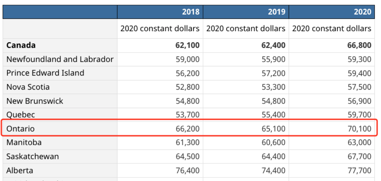其中收入最高的是阿尔伯塔省,2020年税后收入中位数为77700加元,安省排在第二位,安省家庭税后收入中位数为70,100加元,比2019年多出$5000加元。