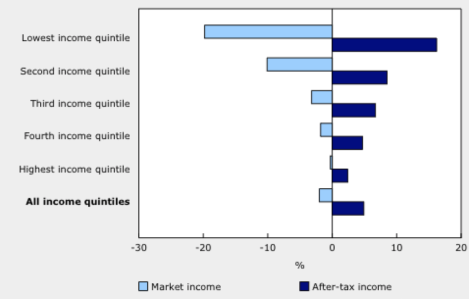 加拿大家庭和独立个体人士的市场收入中位数从 2019 年的 57,600 加元降至 2020 年的 55,700 加元,下降了 3.3%。然而,大流行的影响并不相同,家庭没有遭受就业或收入的损失,损失往往集中在收入较低的家庭和个人中。