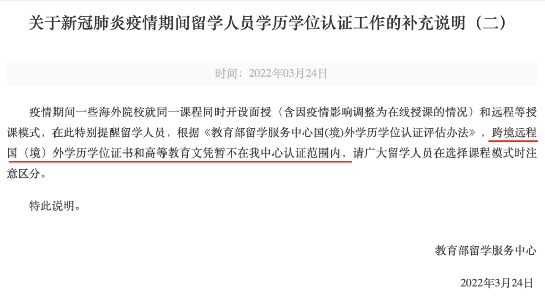 所谓的 ”跨境远程国(境)外学历学位证书“指的是你的学位为online / istance learning / global online所有的远程教育方式的境外文凭是一律不能被认证的。